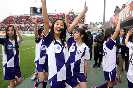 Los abucheos, silbidos y cánticos de los «hinchas» no cesaron cuando las chicas se presentaron ante el público y aún cuando interpretaron la canción “Hidari Mune no Yuuki», tema elegido por los promotores de la “ Sukapa! J League 2012 ”, quienes en el mes de Febrero seleccionaron al grupo como las animadoras oficiales de la liga patrocinada por una televisora satelital.