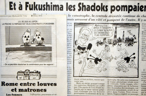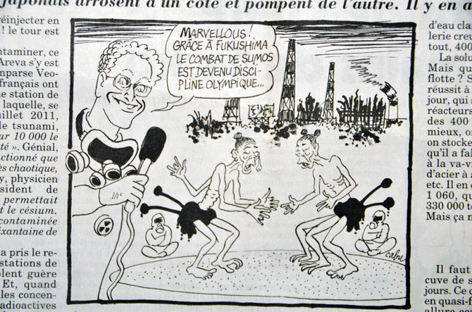 El miércoles, Le Canard enchainé publicó un artículo con dos dibujos, uno de los cuales mostraba un combate de sumo cerca de una central nuclear dañada entre un luchador con tres brazos y otro con tres piernas, mientras un periodista decía: "Maravilloso! Gracias a Fukushima, el sumo se ha incluido como disciplina olímpica".