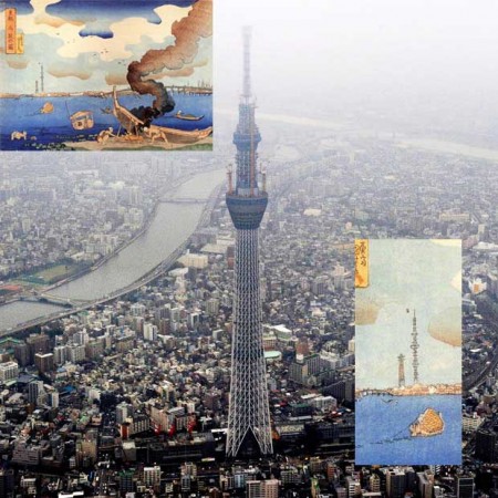 Una torre que se asemeja a la Tokyo Sky Tree , la torre de telecomunicaciones mas alta del mundo actualmente en construcción en el distrito de Sumida Ward en tokyo, se ha encontrado en un grabado Ukiyo-e en madera del siglo XIX atrayendo la atención del público.