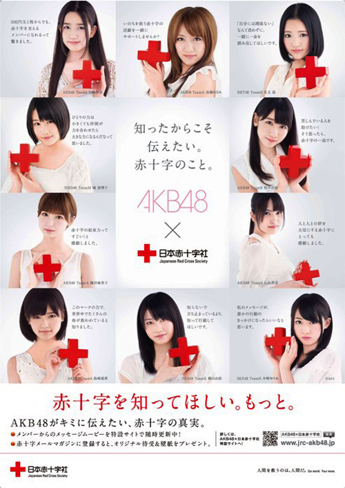 AKB48 colabora con la Sociedad de la Cruz Roja japonesa en una nueva campaña altruista, invitando a la población a unirse a las brigadas de voluntarios en las áreas de prevención y apoyo en casos de desastres, en hospitales y en primeros auxilios, lanzando al aire una serie de tres CM donde aparecen, además de otras integrante de la familia 48, Sayaka Yamamto (NMB48), Jurina Matsui (SKE48), Mayu Watanabe (AKB48), Rena Matsui (SKE48), Minami Takahashi (AKB48) y Haruka Kodama (HKT48), promocionando las respectivas brigadas de apoyo.
