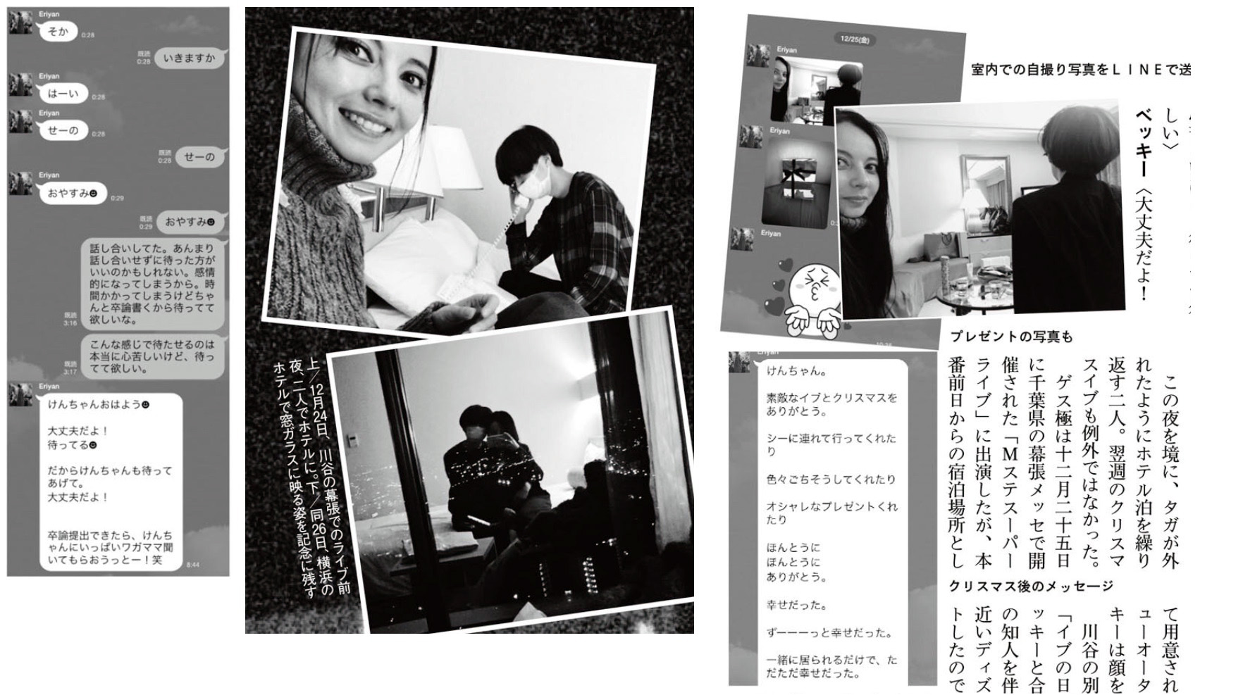 De acuerdo al tabloide, la pareja había estado saliendo desde octubre del año pasado, señalando una relación extramarital, toda vez que el cantante apenas se había casado en el mes de julio, cosa de la que la propia Becky se enteró hasta el mes de noviembre, todo esto en base a una serie de capturas de pantalla obtenidas de la red social «LINE», donde ella sostiene una conversación en la que se habla del proceso de divorcio del músico Kawatani para que este se pueda casar con ella.