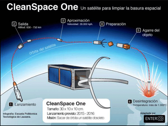 Científicos suizos de la Escuela Politécnica Federal de Lausanne (EPFL) anunciaron un proyecto que consiste en lanzar al espacio el satélite prototipoCleanSpaceOne, cuyo objetivo será limpiar la basura espacial.