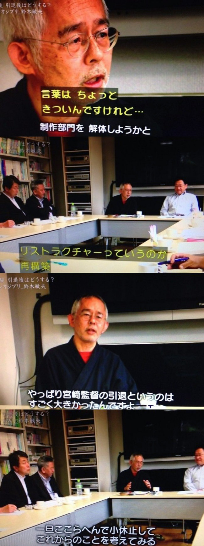 En el programa de TV, se observa a Suzuki sentado junto con un grupo de hombres alrededor de la mesa de juntas del estudio dirigiendo unas palabras con el rostro cansado y diciendo: «Mi elección de las siguientes palabras podrán parecer un poco duras, pero me pregunto si no deberíamos desmantelar la división de producción».