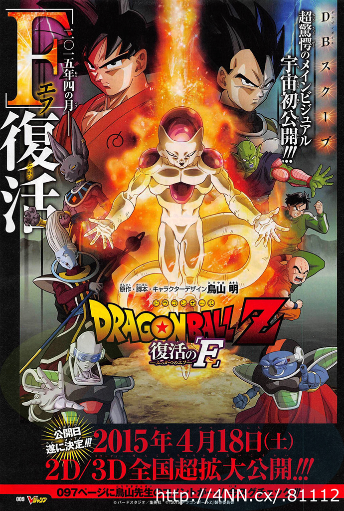 El pasado 17 de noviembre la revista Vjump de la editorial Shueisha reveló un poster y más detalles de la próxima película titulada «Dragon Ball Z: Fukkatsu no F» (Fukkatsu significa resurrección, pero también la «F» hace alusión a Freezer), la cual será estrenada en salas de cine niponas el 18 de abril en 2D y 3D.