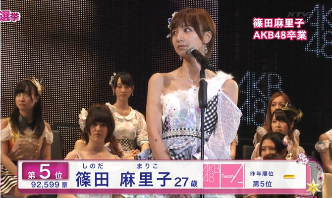 Hubo dos sorpresas en la noche, comenzando con Mariko Shinoda (27), quién a pesar de ubicarse en la quinta posición anunció su graduación del grupo para el mes de julio y la segunda sorpresa fue Natsumi Hirajima, ex-AKB48 (expulsada por quebrantar las reglas idol) quién logró ubicarse en la posición 62, lo que significa que regresará temporalmente a las filas de la familia 48.