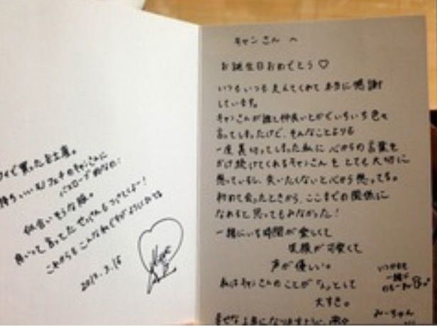 Wotas han comparado la caligrafía de la tarjeta de felicitación contra autógrafos así como escritos varios de su autoría y aseguran que en la "melosa" tarjeta de felicitación, con fecha del 15 de marzo de este año, y que supuestamente está escrita con el puño y letra de "Micchan", ella se dirigie al visualero para felicitarlo por su cumpelaños y agradecer el apoyo que ha recibido de su parte.