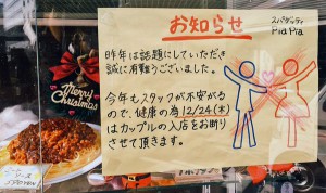 El restaurante de Spaghetti llamado «Piapia», localizado a las afueras de la capital en el distrito de Hachioji, recientemente ha pegado un cartel dibujado a mano en una de sus ventanas y cuyo texto sentencia: