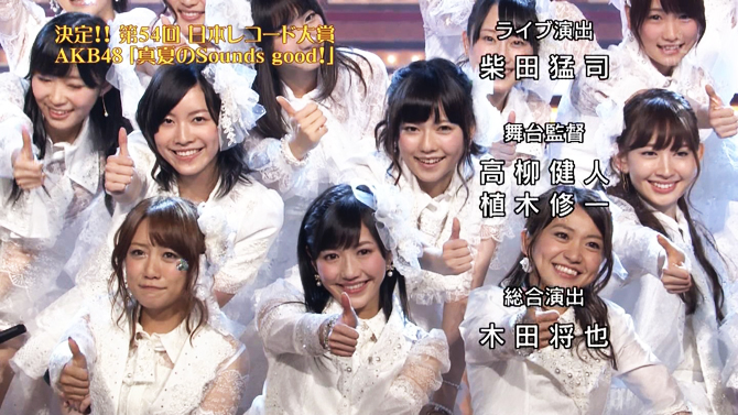 El domingo 30 de diciembre se realizó el espectáculo anual de premios de música «The 54th Kagayaku! Japan Record Awards» en el cual se anunció que el grupo idol AKB48 obtuvo por segundo año consecutivo el primer premio, en esta ocasión por la melodía «Manatsu no Sounds Good!» (escrito por Yasushi Akimoto con arreglos de Inoue Yoshimasa). El año anterior, el grupo recibió el primer lugar también pero con la canción «Flying Get».